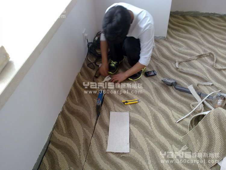 一、手工地毯常规方法:生产前必须测量场地尺寸,根据图案定制生产,大货车或拖车搬运,吊车或叉车卸货与上货。地毯辅料:钉条、收口条。专业地毯铺工安装。